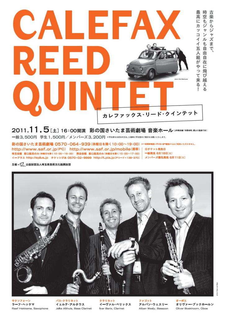09年の来日で音楽愛好家を唸らせ、音楽関係者も注目している話題のオランダのグループ カレファックスは、Ob・Cl・Sax・B-Cl・Fgという珍しい編成。古楽からジャズ、現代音楽までという幅広いレパートリーを持ち、たった5本の楽器で全く想像もつかない音の世界を作り出します。オーケストラ並みの表現力とまるで楽器で会話をしているような絶妙なアンサンブルは一度聴くと必ず虜になります!